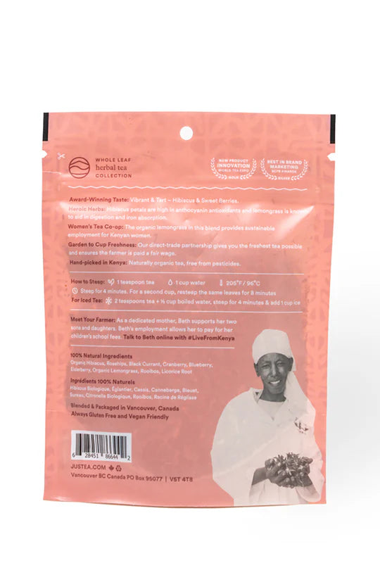 JusTea has added their hand-picked, organic hibiscus to their caffeine-free herbal blend so you can sip and enjoy the same tea as the Kenyan women do! Little Berry Hibiscus is a beautiful burst of color: pink hibiscus petals, purple berries, green lemongrass and red rooibos, with vibrant, tart notes of hibiscus and sweet berries. It is also delicious over ice.