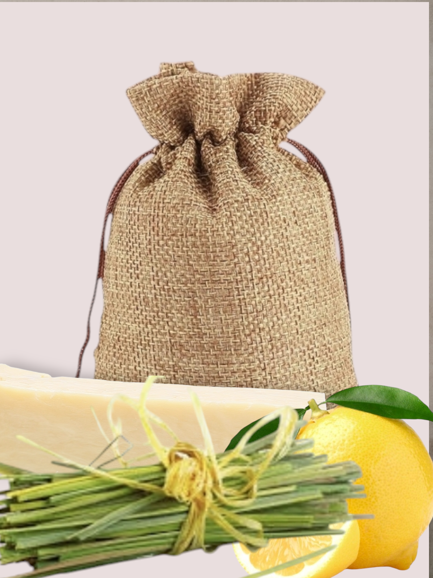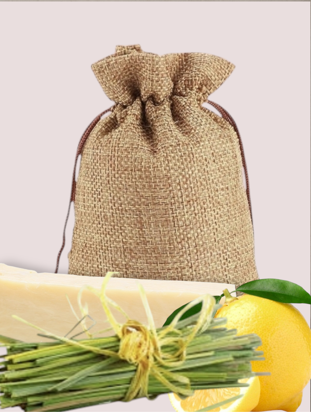 Comes with Burlap wrap mesh bag. Soap in bag for a light exfoliation.