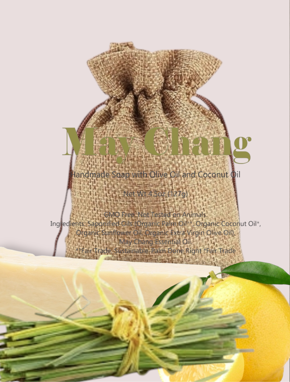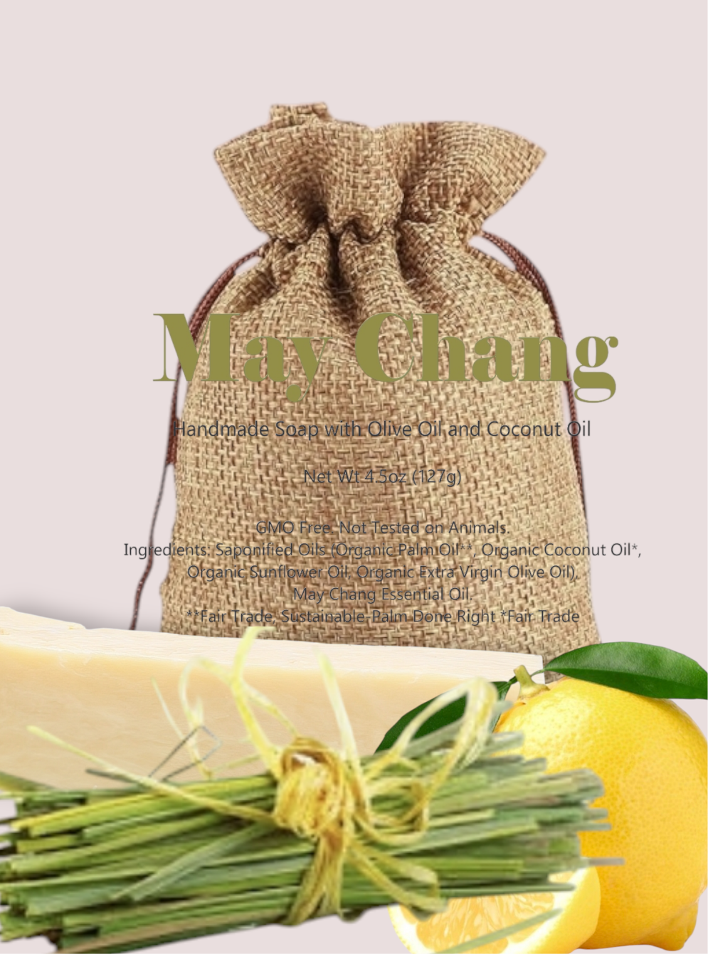 Ingredients: Saponified Oils (Organic Palm Oil**, Organic Coconut Oil*, Organic Sunflower Oil, Organic Extra Virgin Olive Oil), May Chang Essential Oil. **Fair Trade, Sustainable-Palm Done Right, *Fair Trade