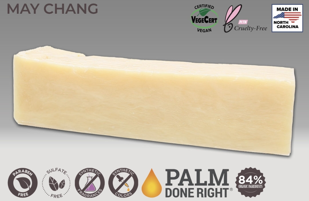 May Chang (Litsea) essential oil is similar to lemongrass, but with a sweeter and stronger lemon note and a light "oriental" note in the back drop. If you like lemongrass but want a "lemon punch" try May Chang, we think you'll like it. Our May Chang Soap is made with 85% organic ingredients and is all natural.