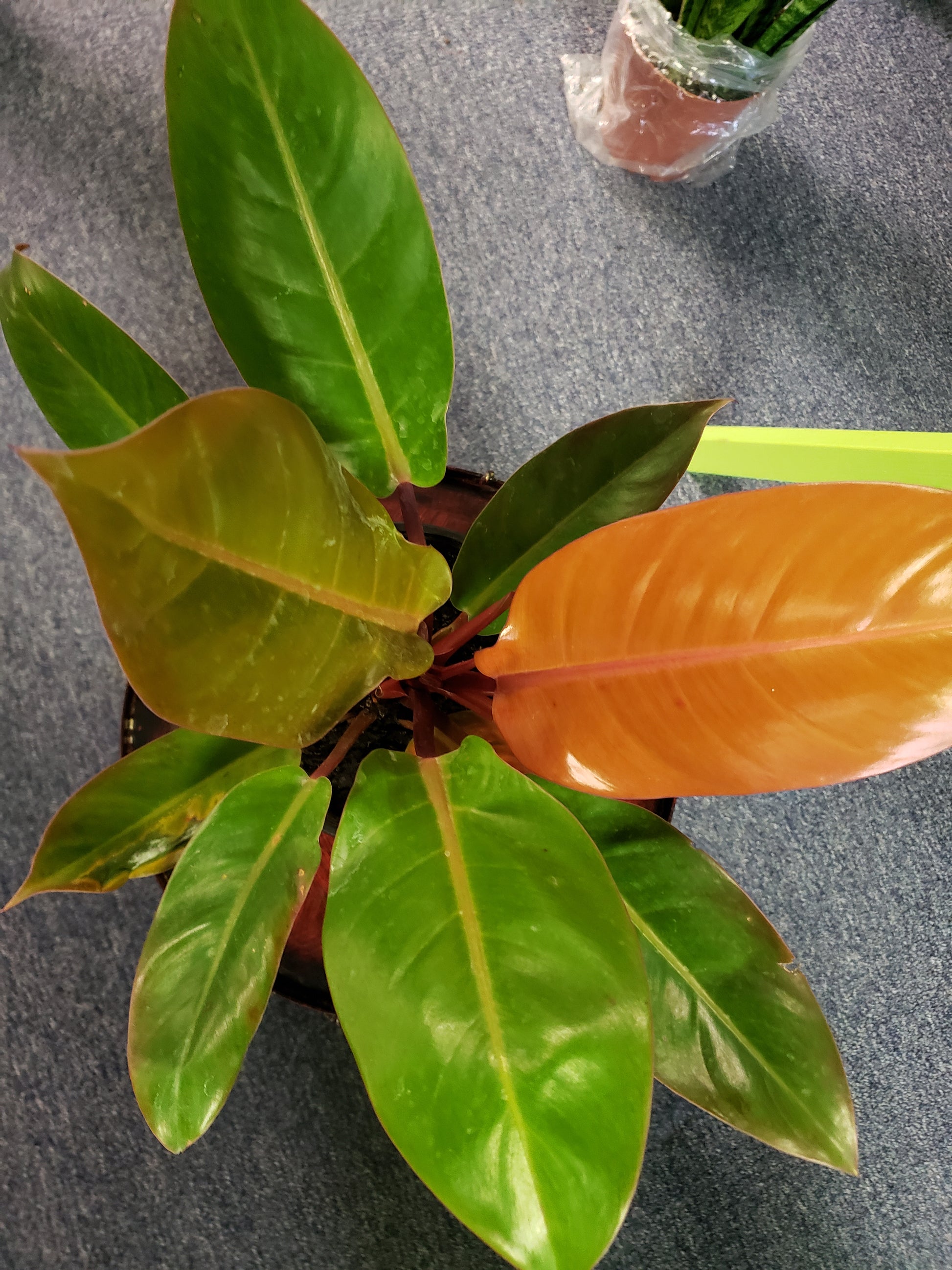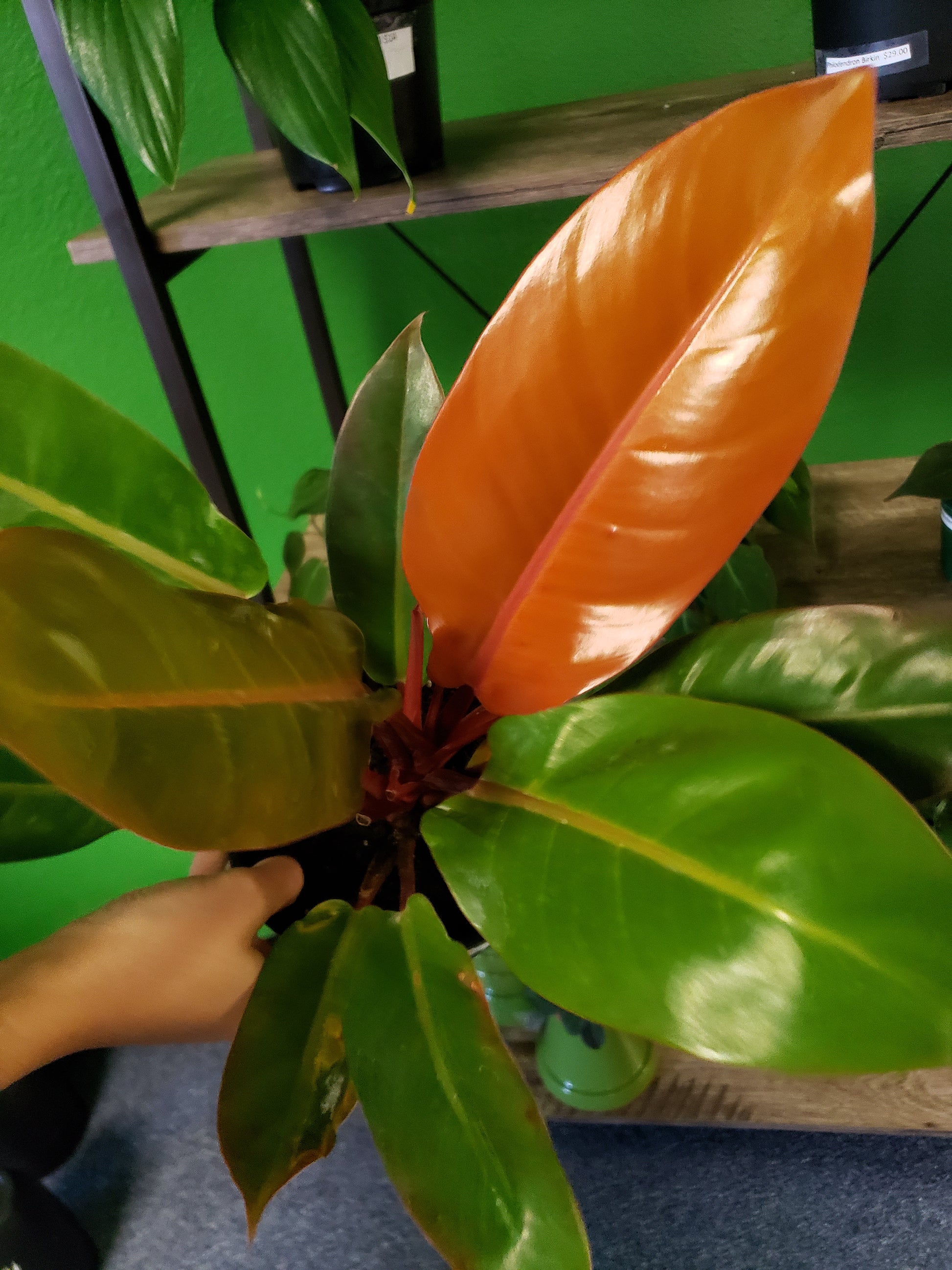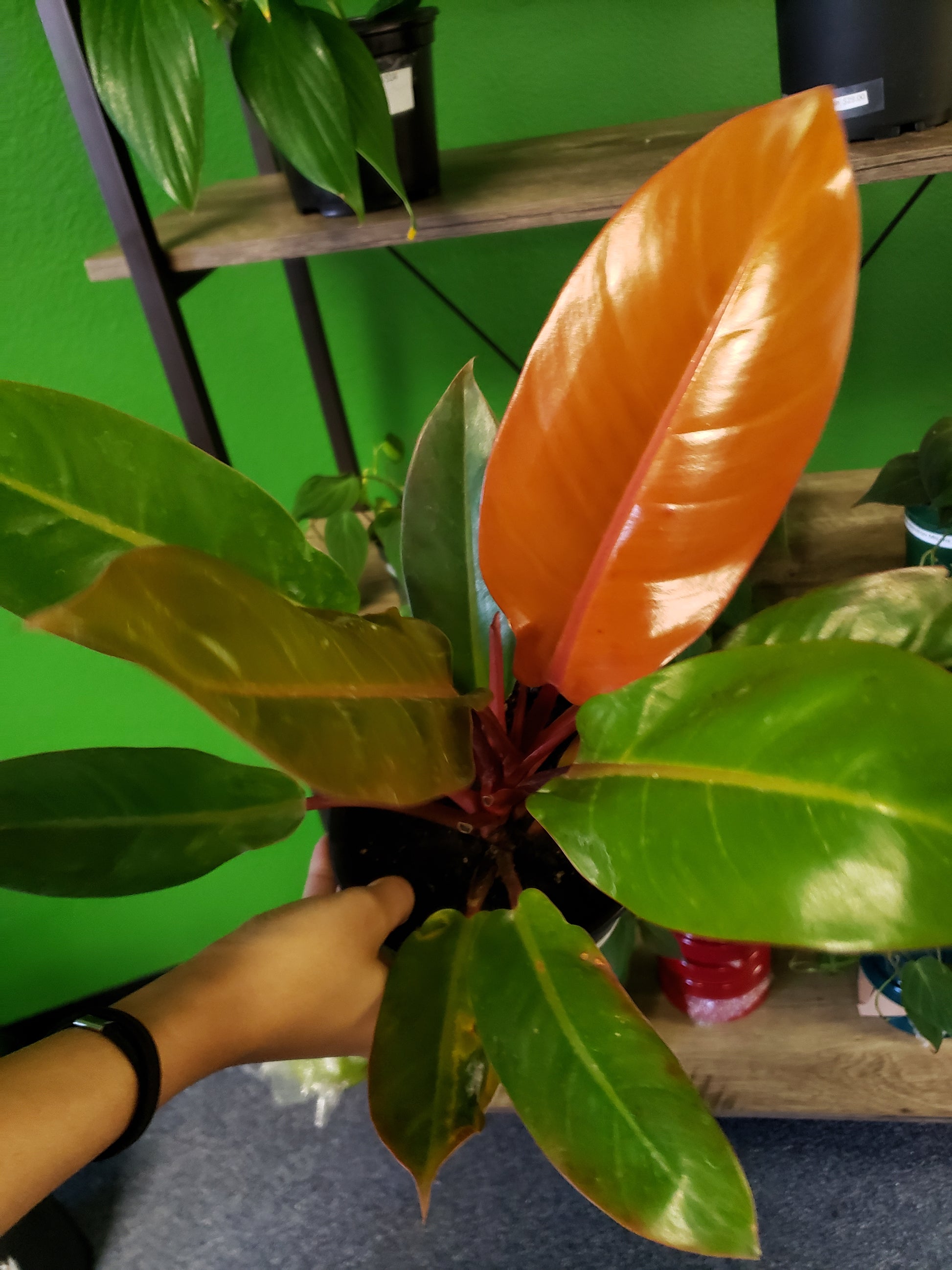 This plant is a self-heading Philodendron hybrid. Unlike many Philodendron varieties, the Prince of Orange grows its vibrant leaves from its center rather than from vines or stems.