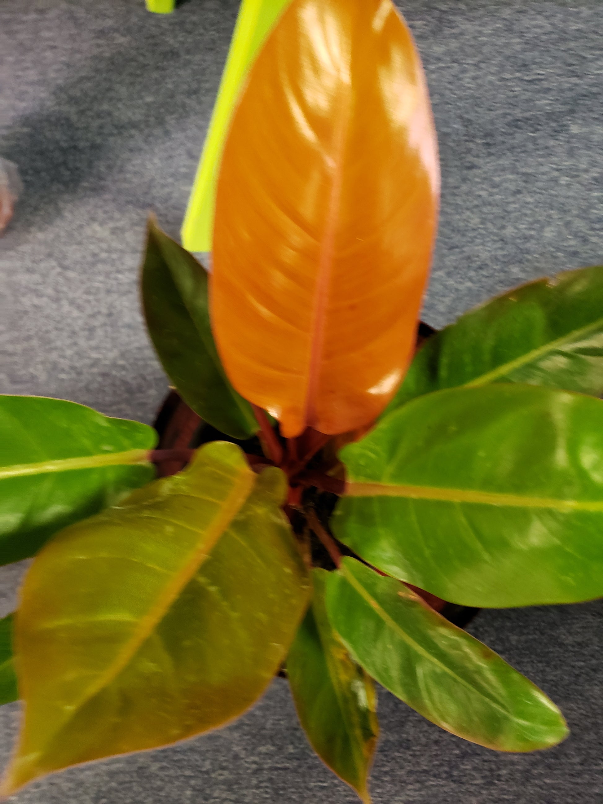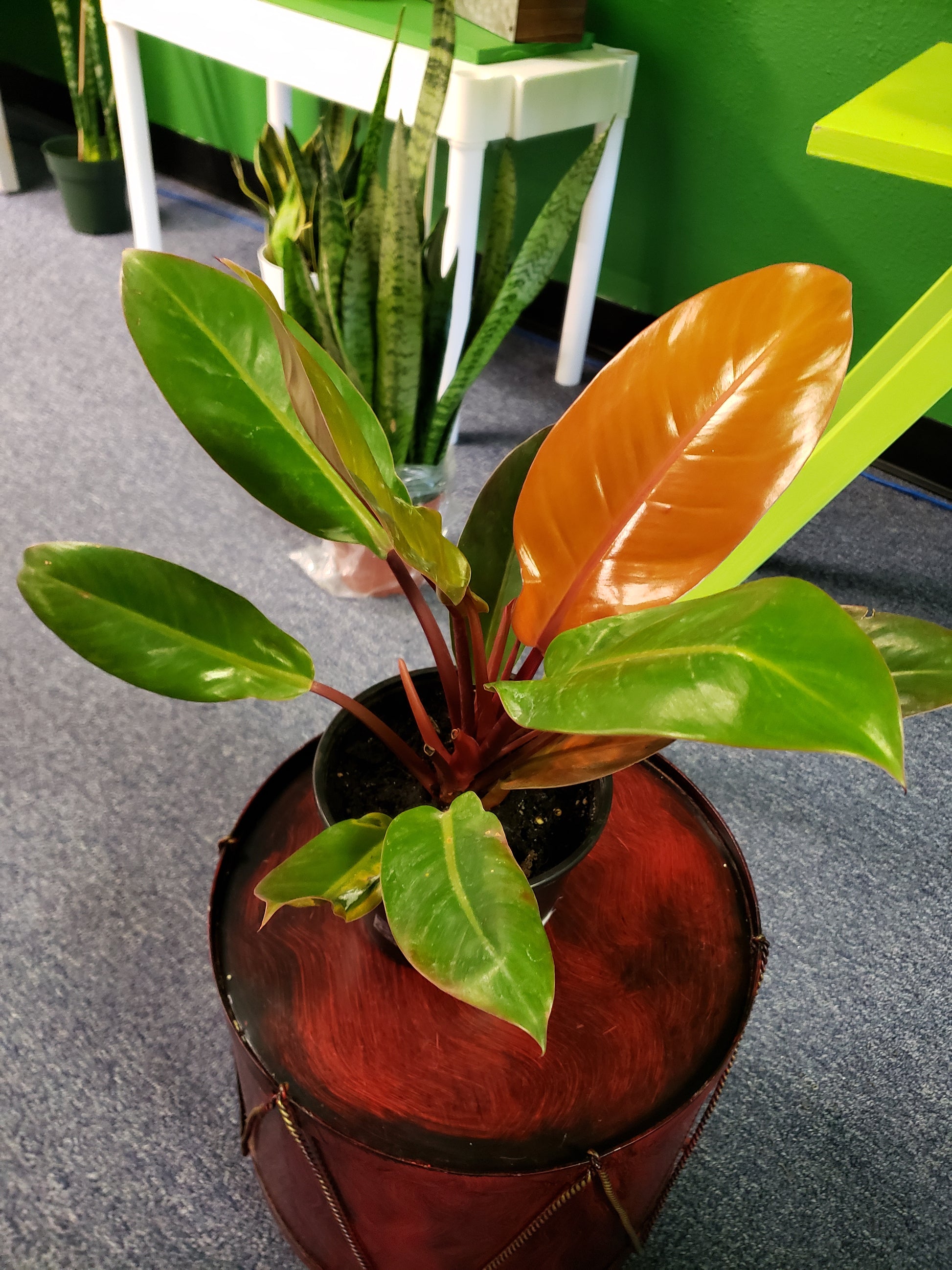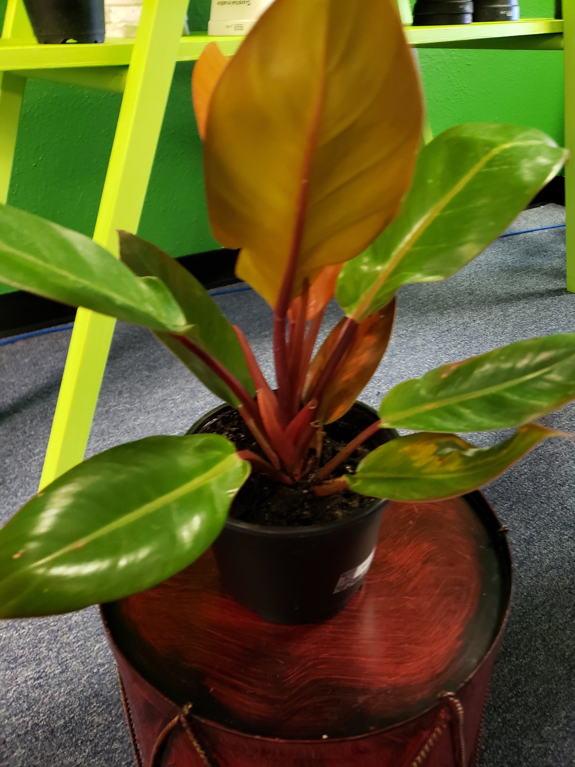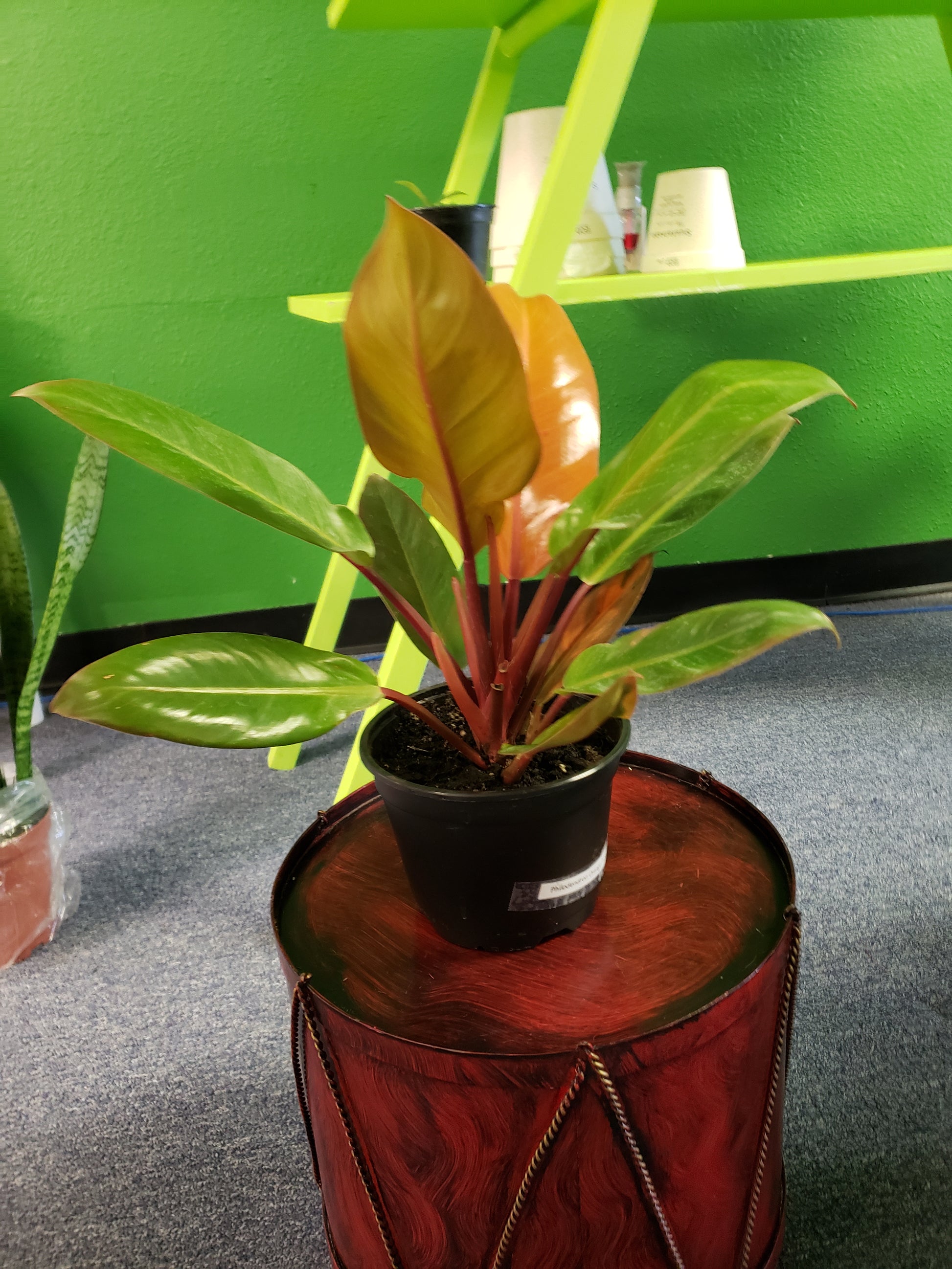 This plant is a self-heading Philodendron hybrid. Unlike many Philodendron varieties, the Prince of Orange grows its vibrant leaves from its center rather than from vines or stems.