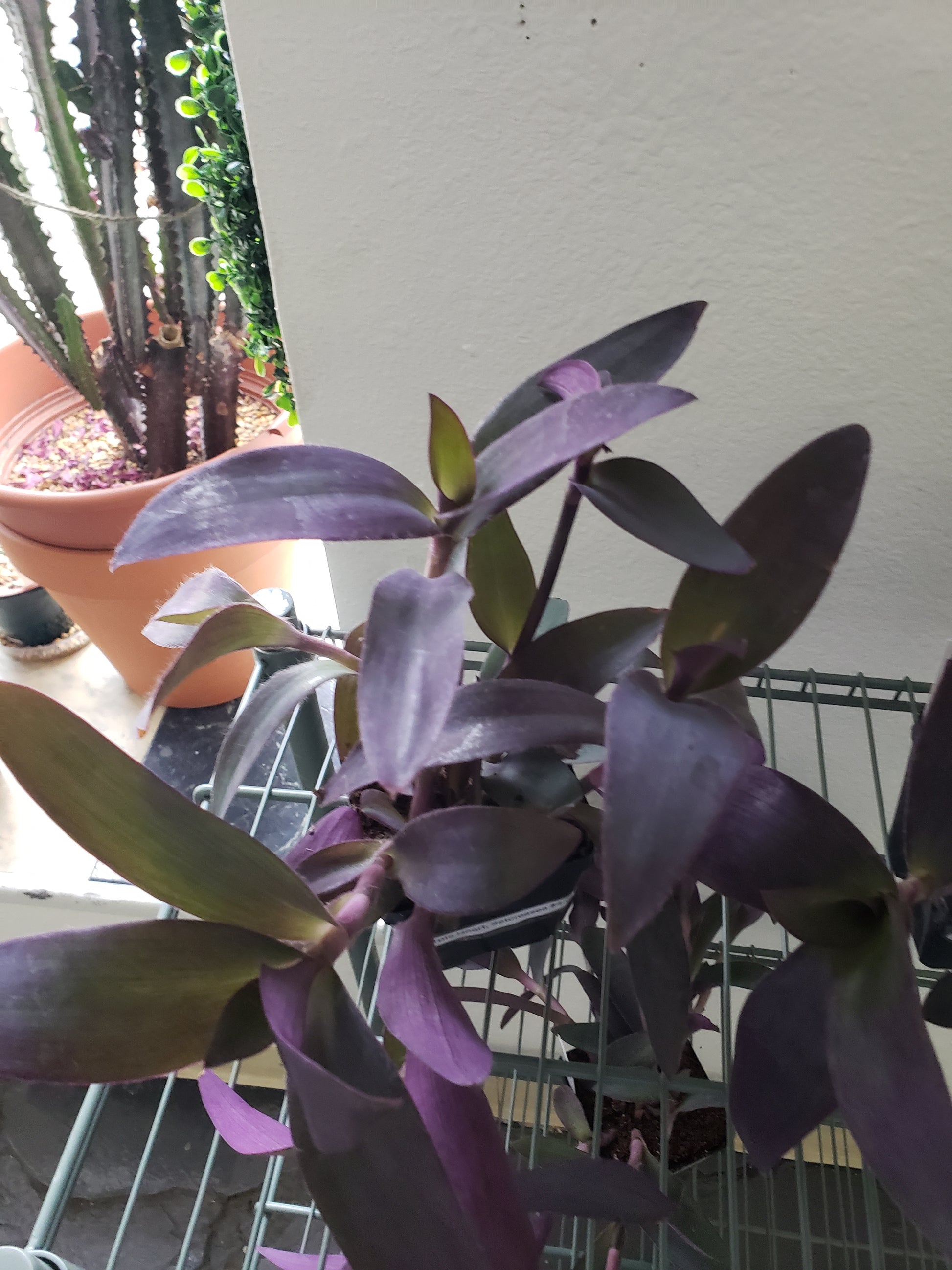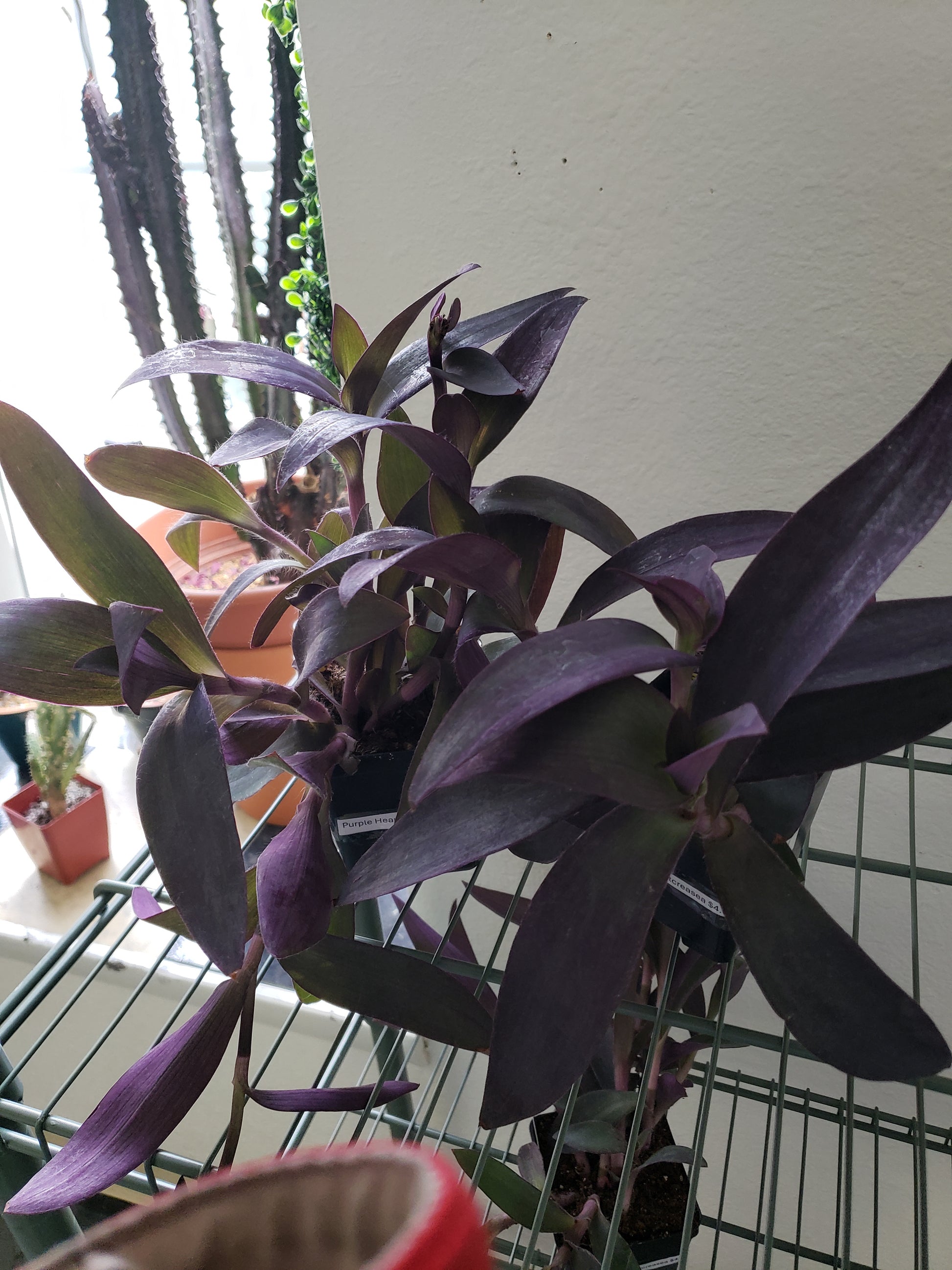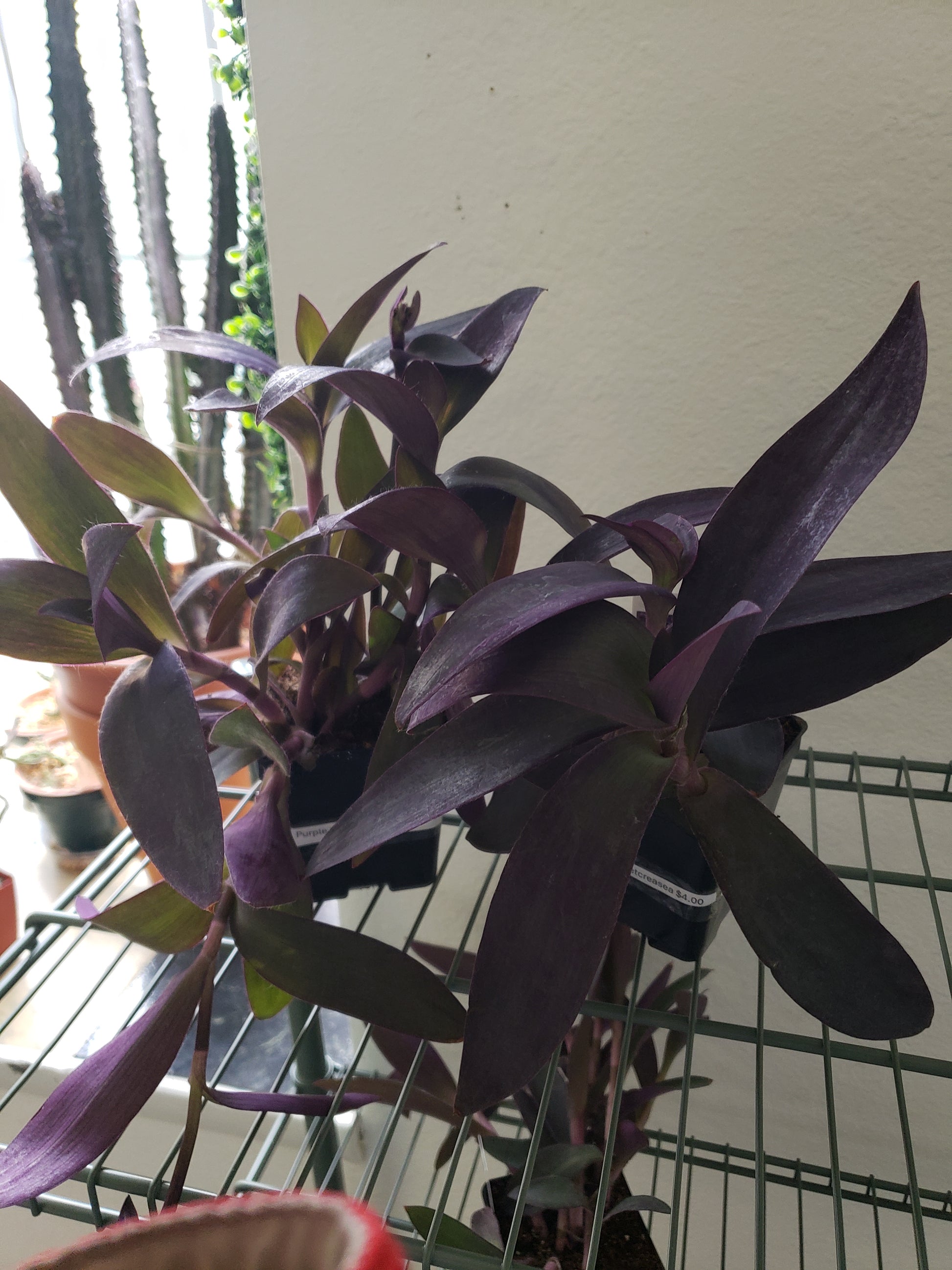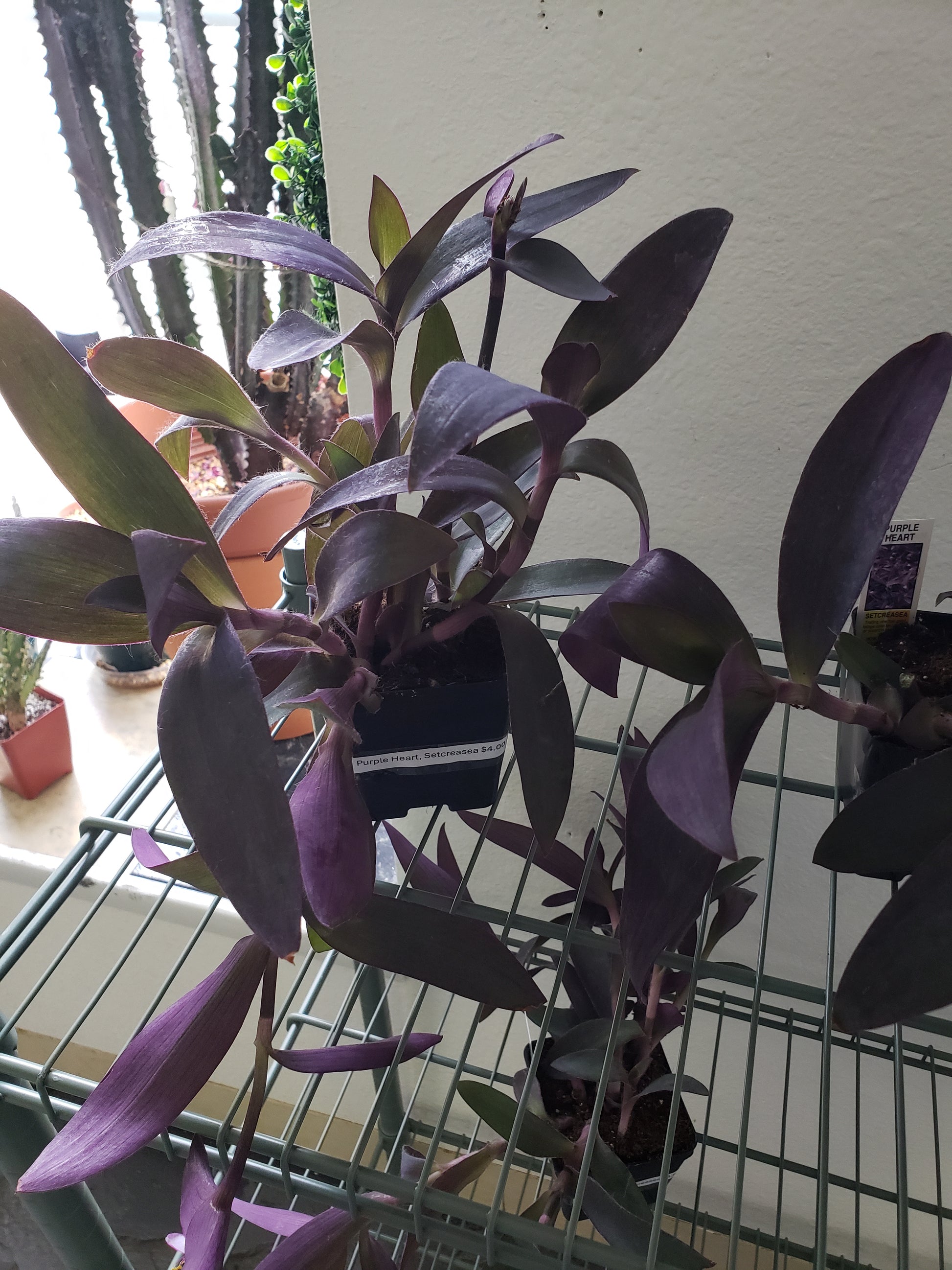 A bold beauty with deep purple trailing stems, perfect for hanging baskets or sunny patios. Loves bright light to keep its vivid color and thrives indoors or out.