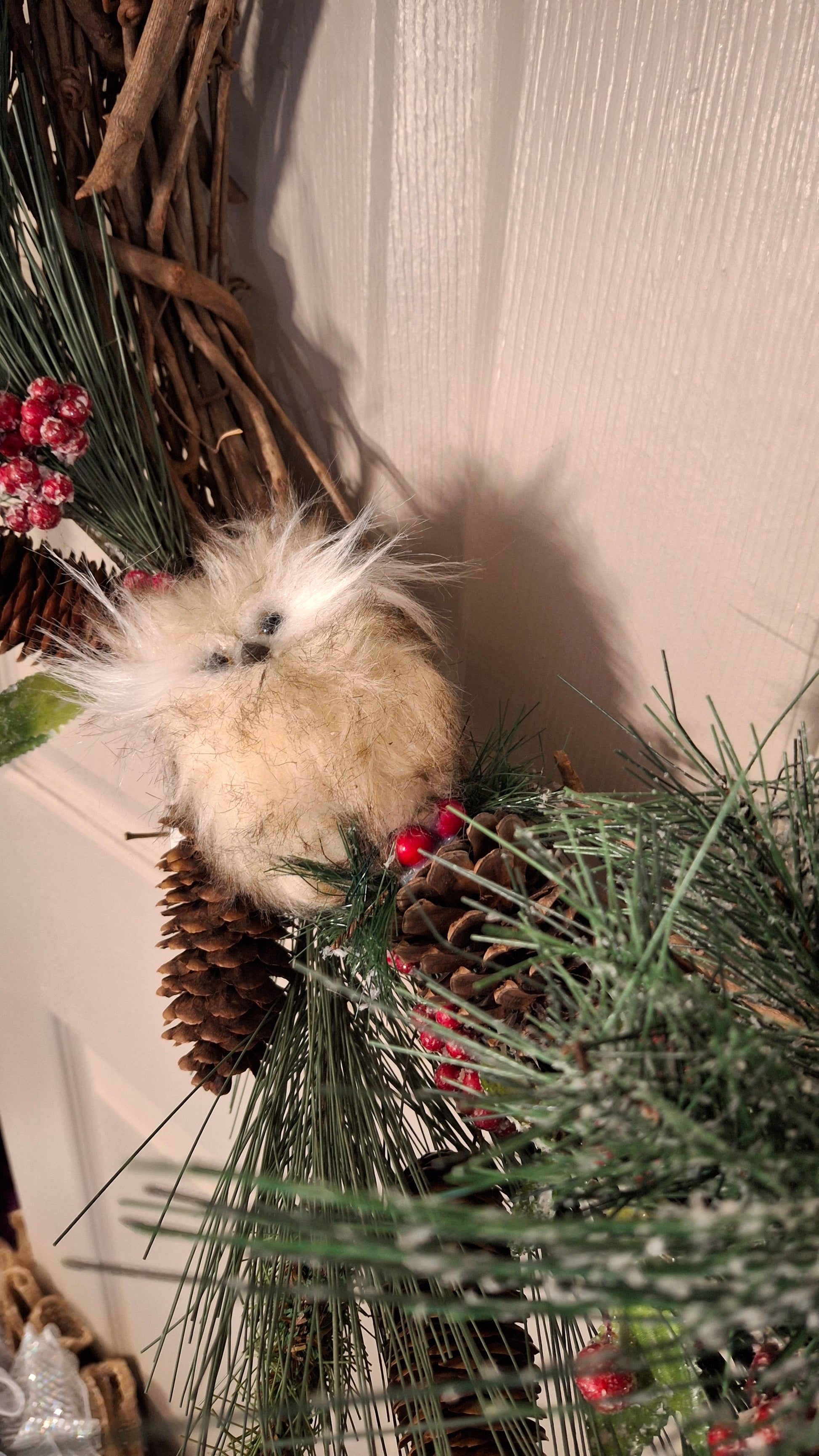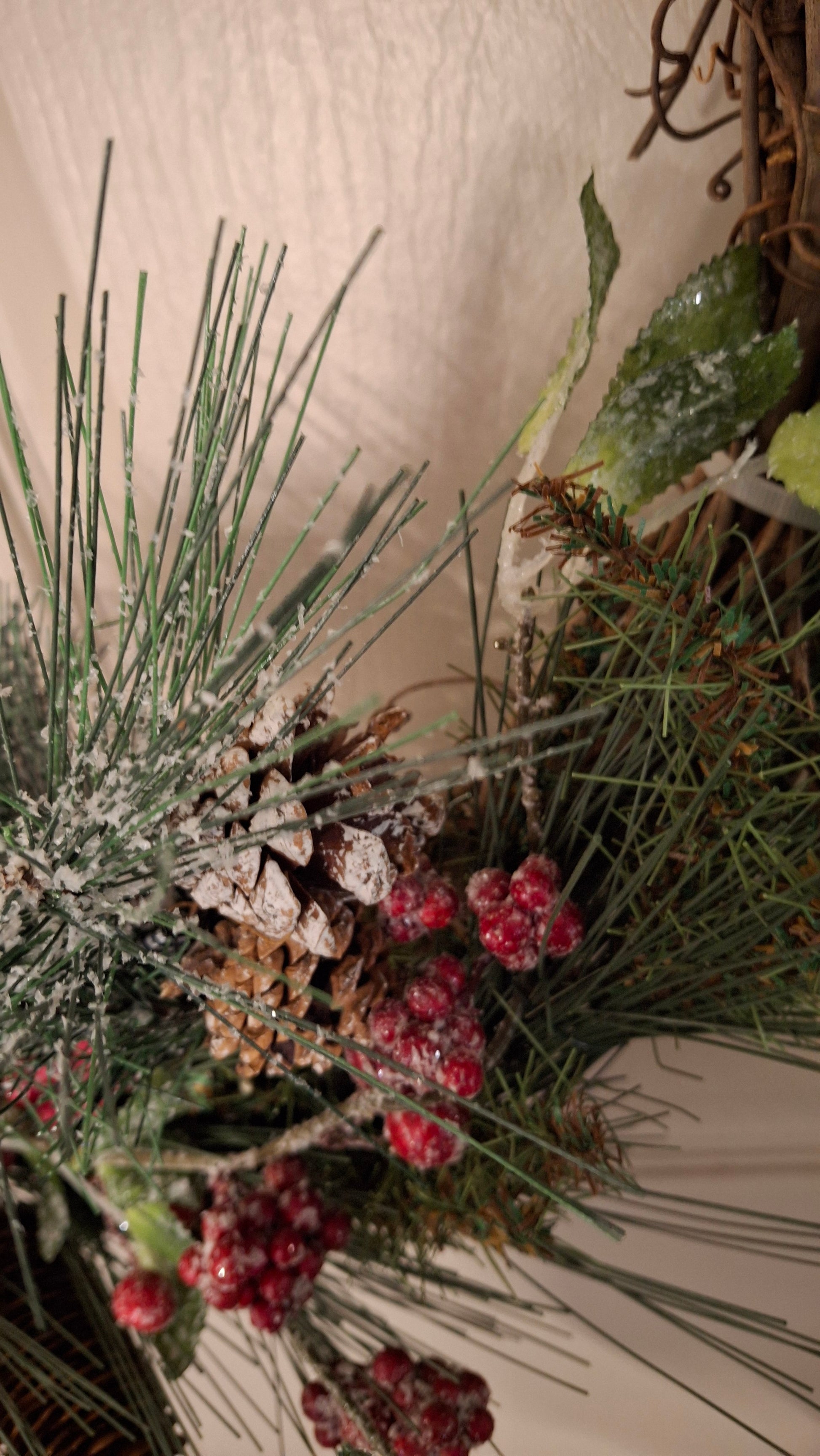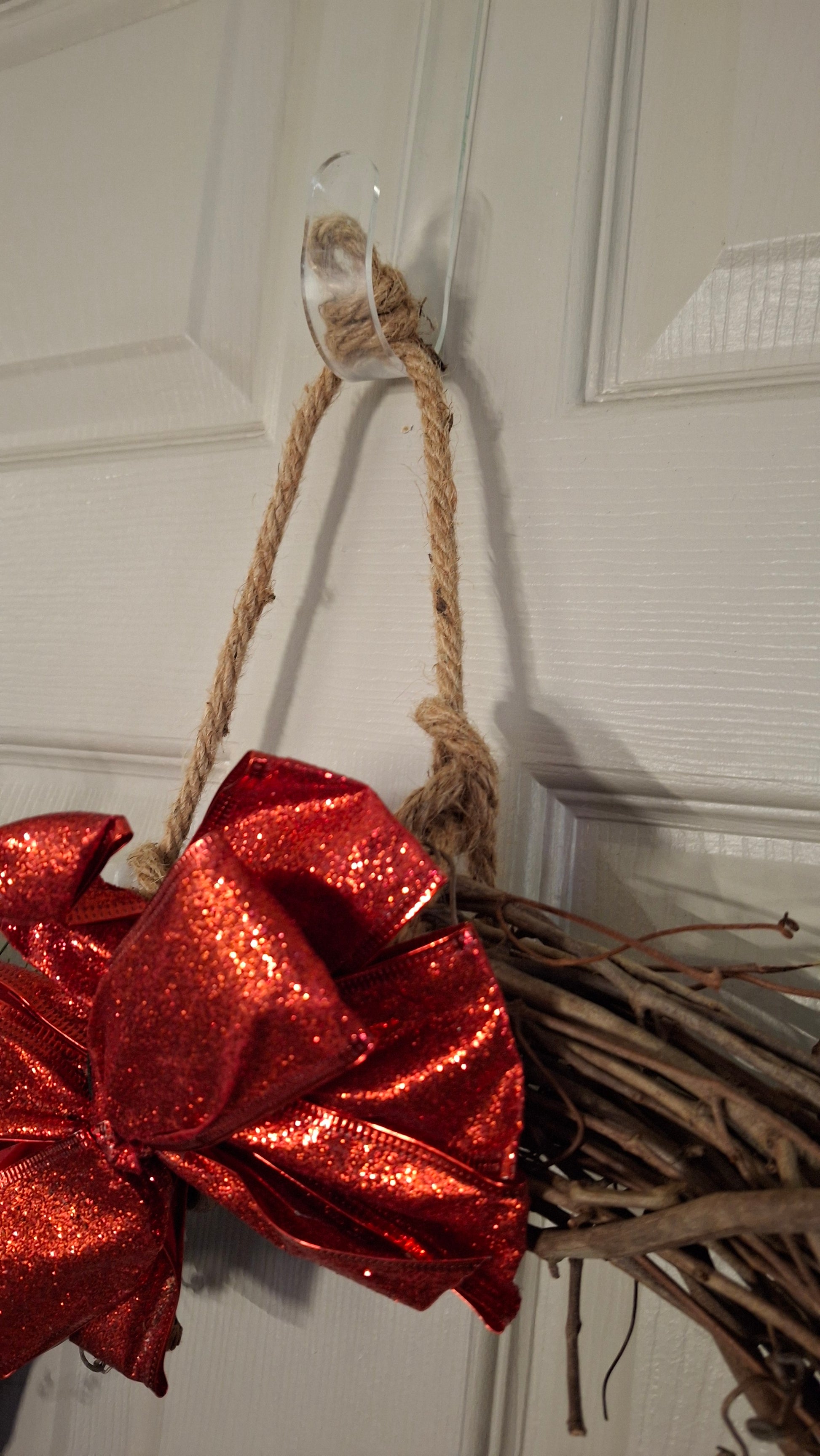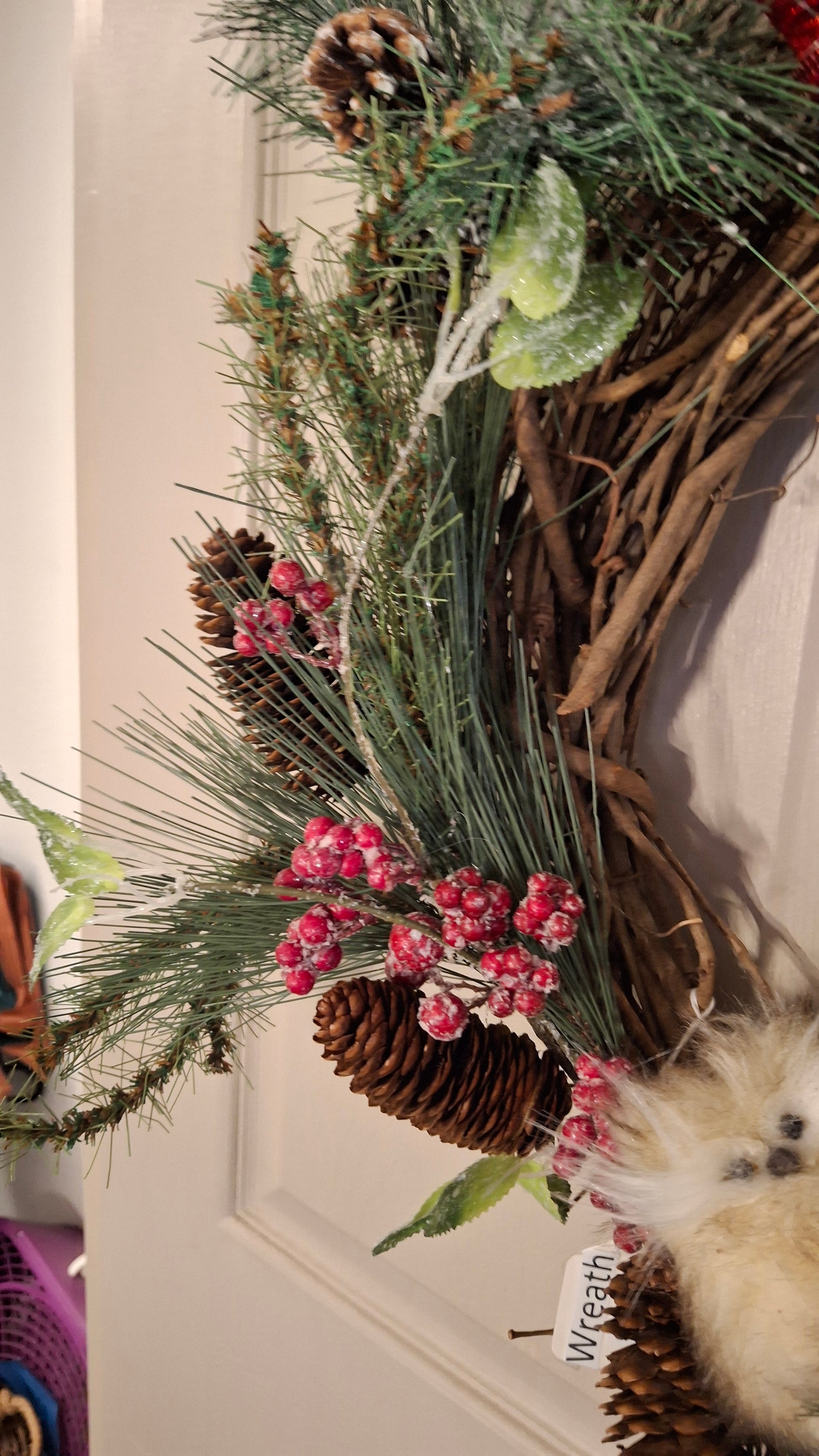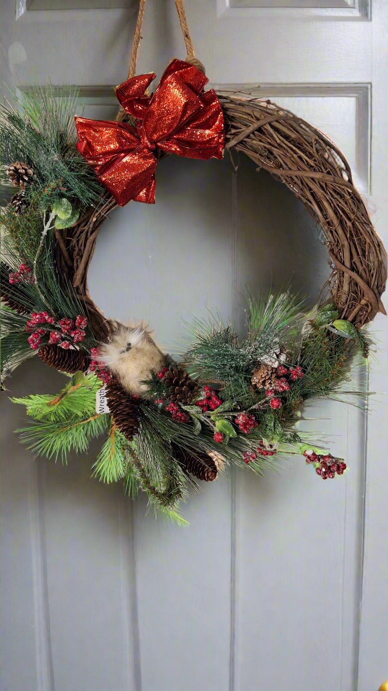 Approximately 17" across and 20" top to bottom from top of red bow to bottom of plant at the bottom, Hang over the door or wall and express a bit of creative holiday spirit with this unique and beautiful wreath. This one includes attached rope hanger. Handmade item.