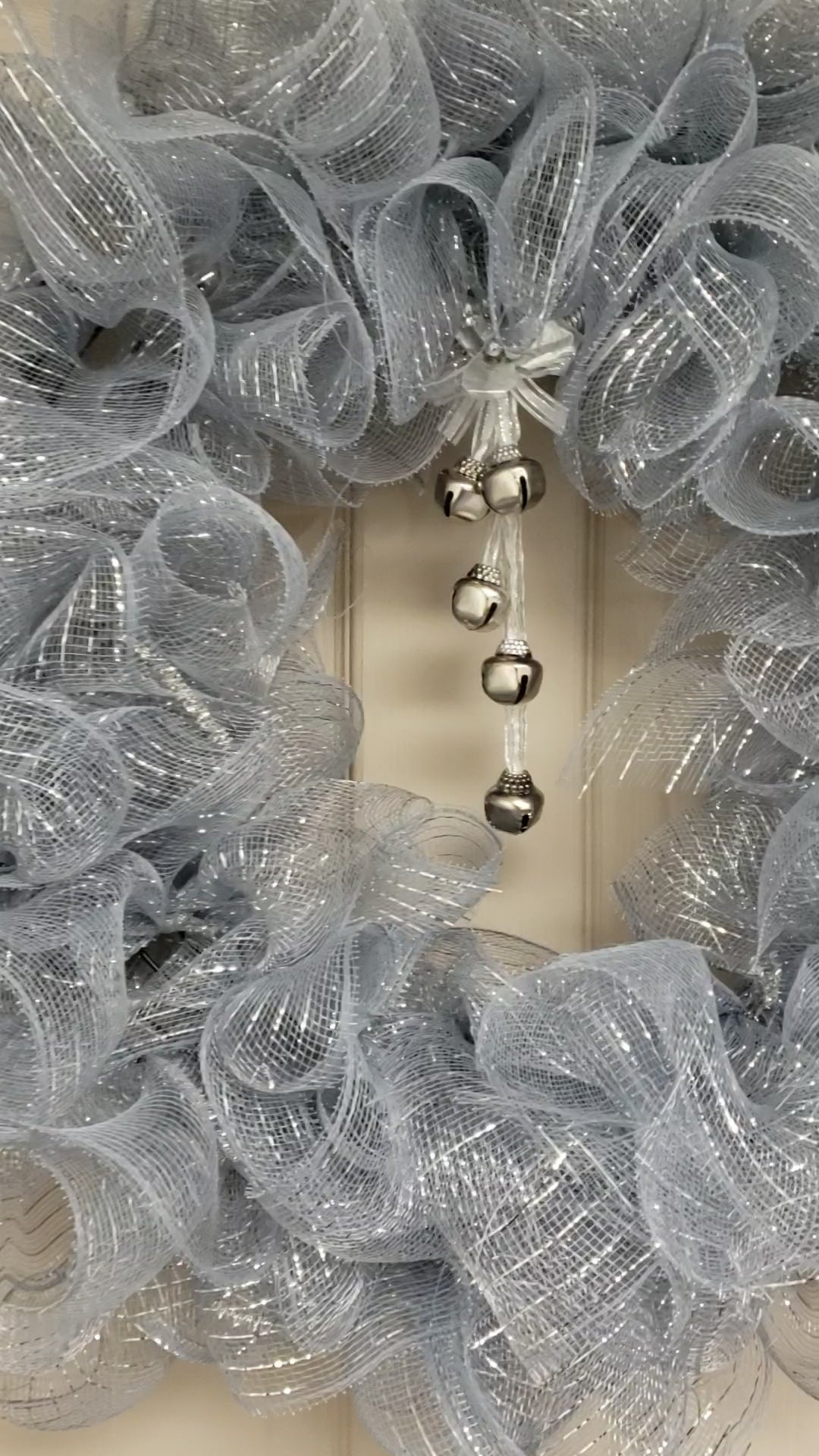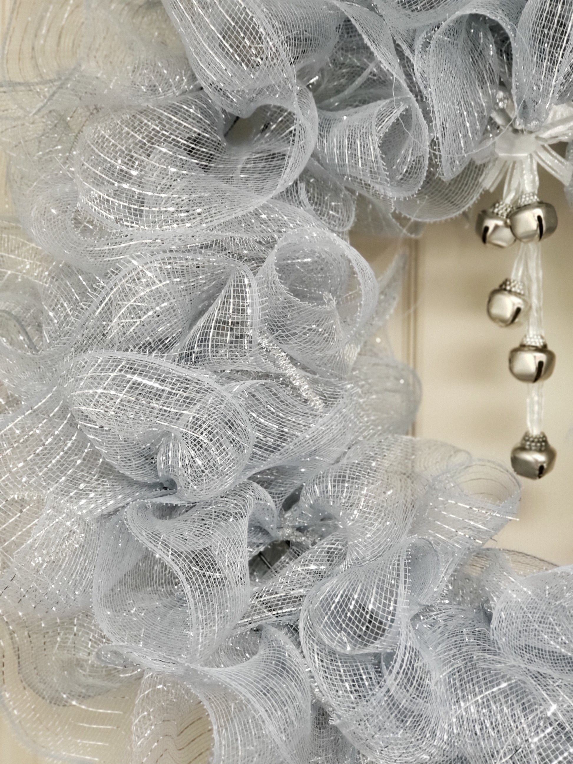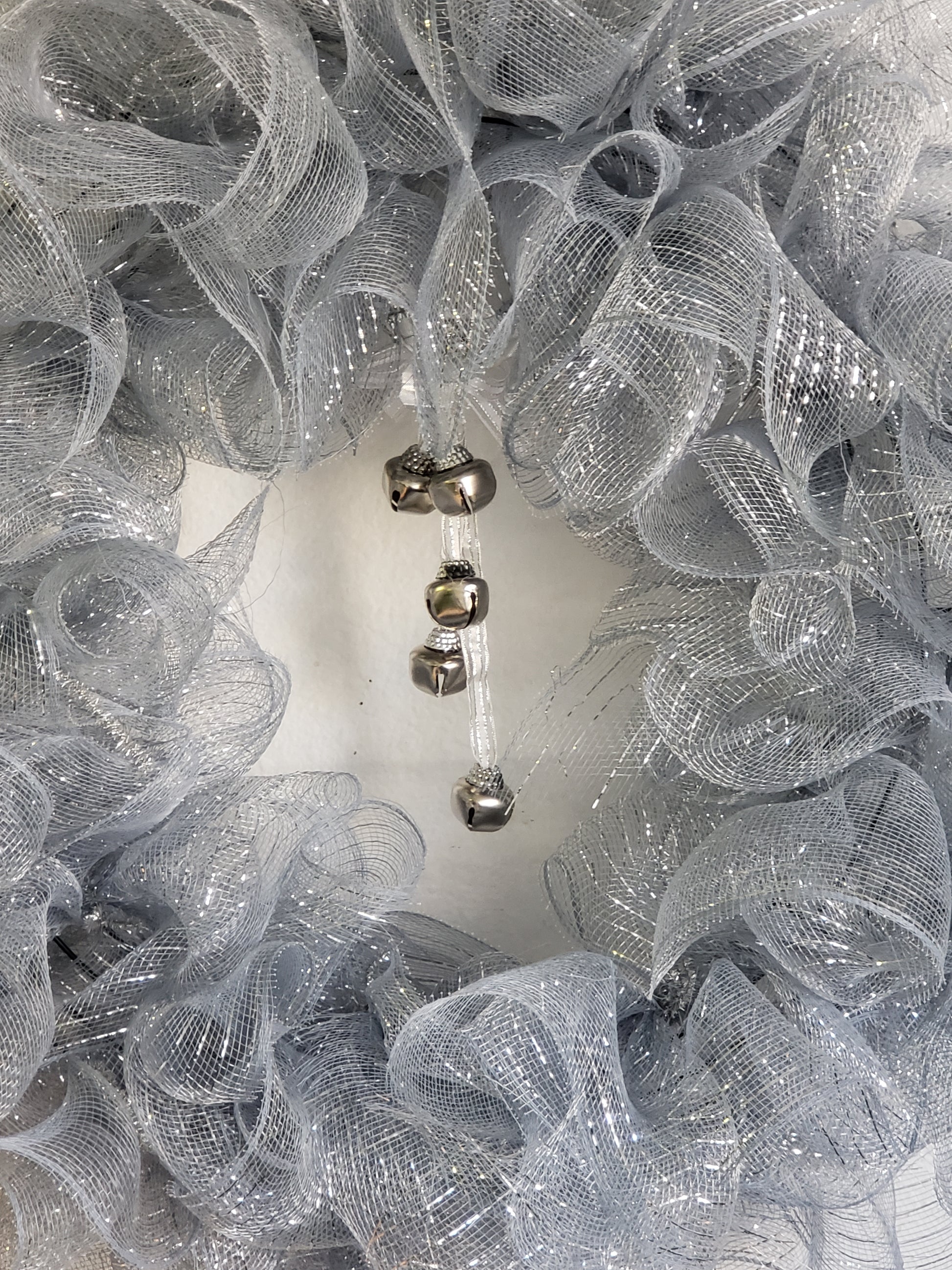 Mesh ribbon with shiny silver streaks. Silver Bells in center of wreath. Beautiful, Beautiful, Beautiful!