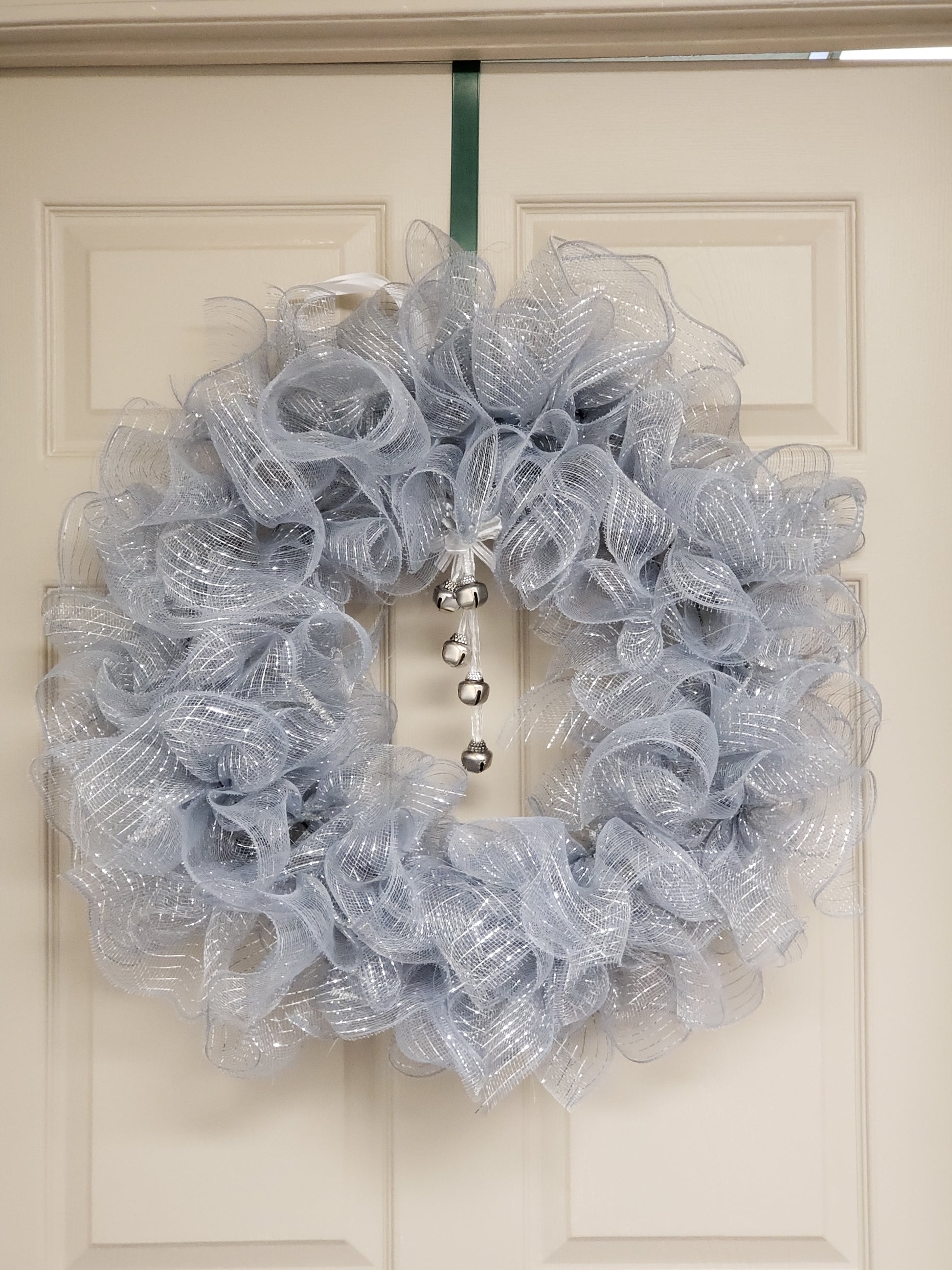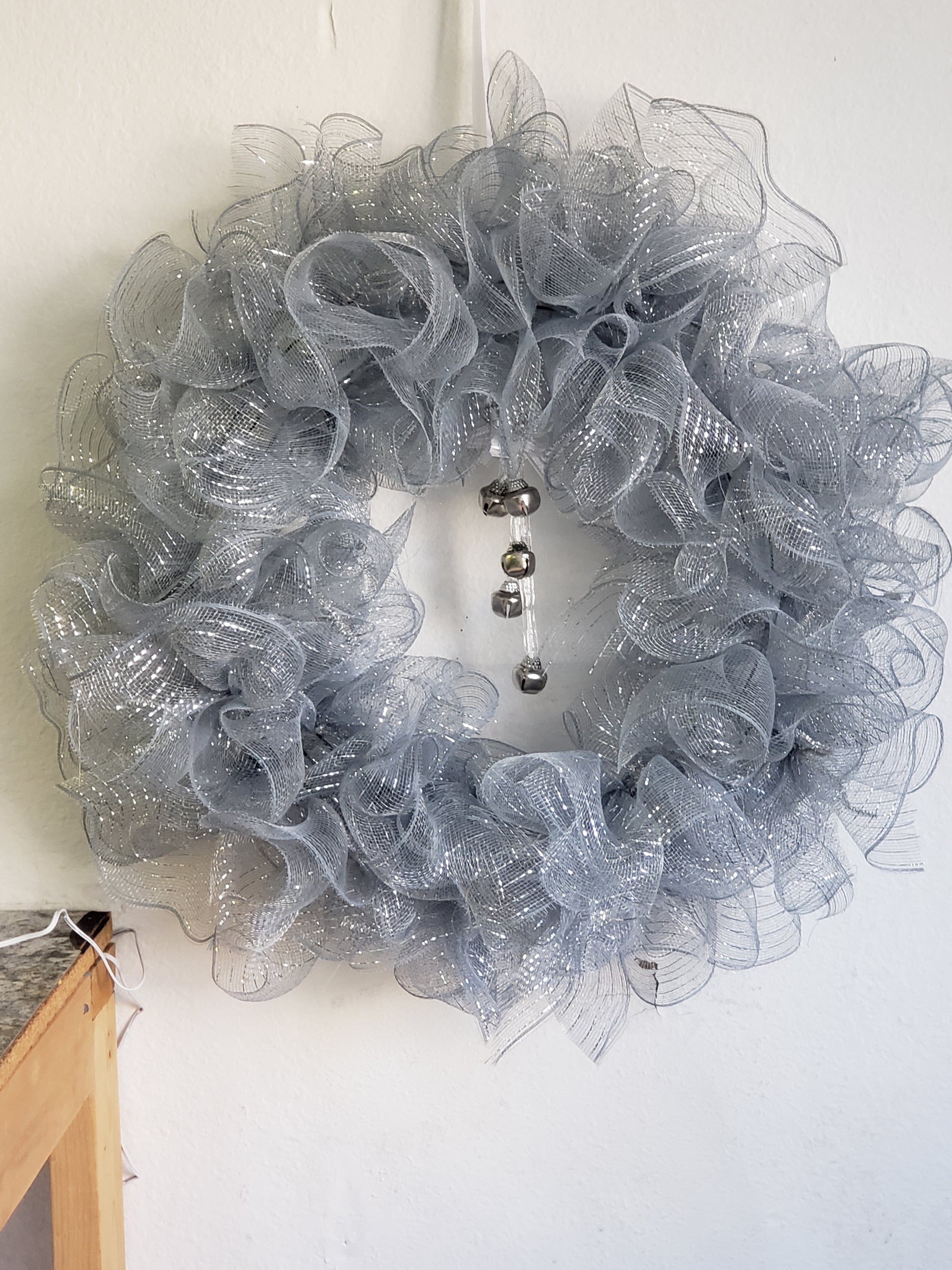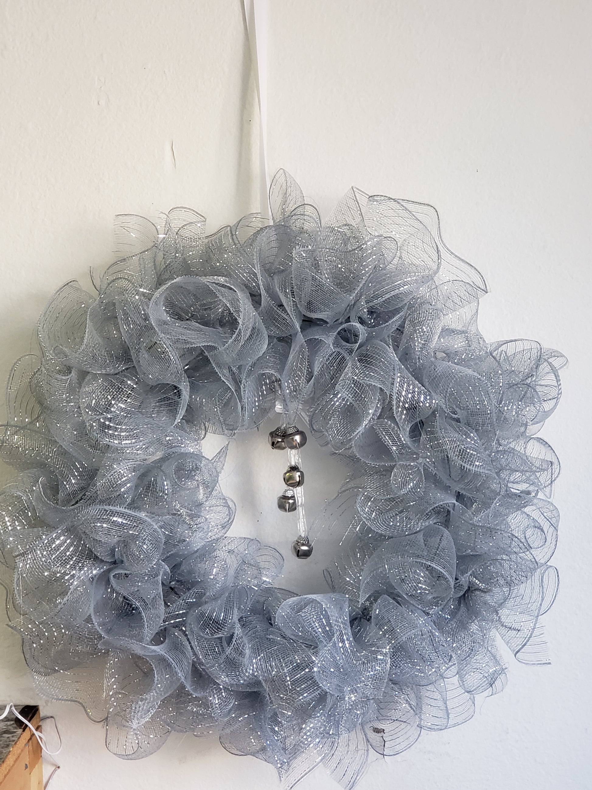 Mesh ribbon with shiny silver streaks. Silver Bells in center of wreath. Beautiful, Beautiful, Beautiful!